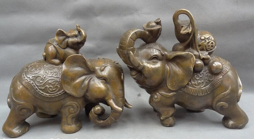 JP S0608 8" Chinese Bronze Copper Wealth YuanBao Fu Gourd Elephant Family Statue Pair